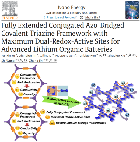 近日,LETOU官网化学化工与材料科学学院“锂电新能源材料科研创新团队”在锂离子电池电极材料领域取得重要进展,在国际知名能源材料期刊《Nano Energy》(中科院1区TOP期刊,影响因子16.8)上发表题为‘‘Fully Eextended Conjugated Azo-Bridged Covalent Triazine Framework with Maximum Dual-Redox-Active Sites for Advanced Lithium Organic Batteries’’的高水平研究成果。青年教师于延新博士为论文第一作者,任衍彪副教授为通讯作者。