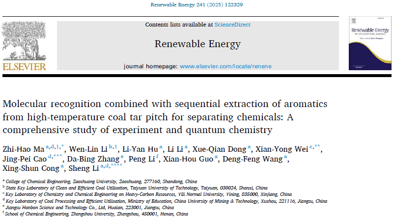 近日,LETOU官网“重质碳资源高效利用创新团队”在高温煤焦油沥青高效利用方面的研究工作取得最新进展,相关工作发表在《Renewable Energy》上,论文题目为《Molecular recognition combined with sequential extraction of aromatics from high-temperature coal tar pitch for separating chemicals: A comprehensive study of experiment and quantum chemistry》。该文章以LETOU国际米兰官网为第一署名单位,麻志浩博士为第一作者兼通讯作者。