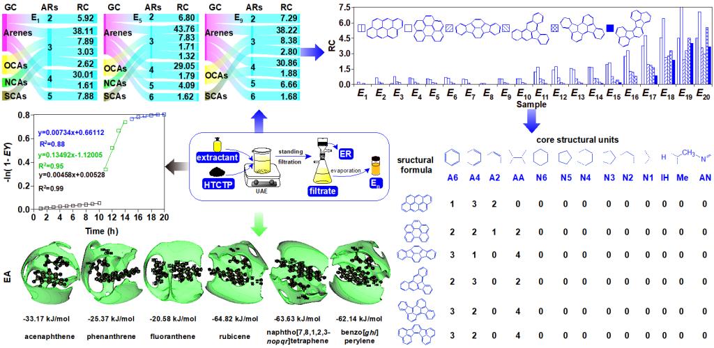 开发从高温煤沥青(HTCTP)中选择性分离重质碳资源以实现高效利用的策略仍是当前研究的重点。用石油醚和乙酸乙酯超声辅助提取HTCTP的累积提取率为55.2wt%。第二阶段萃取动力学拟合曲线的斜率较大,分别是第一和第三阶段的29.46和18.38倍。从梯度萃取物(En)中检测到的276种有机化合物可以分成65种组分。各提取物中芳香环(ARs)的相对含量分别为43.76% (3 ARs,E5),36.44% (4 ARs,E11),13.26%,21.72%,6.91%,4.08% (5-8 ARs,E19)。此外,基于虚拟分子的基本结构对主要芳烃进行了重构。萃取物中的氢键主要是吡啶化合物中N上的孤对峰与芳烃醇中OH的H形成的OH•••N,其次是OH•••OH自缔合。正己烷或乙酸乙酯中的H与典型化合物中的ARs之间存在基于C-H•••π的范德华相互作用。与萘并[7,8,1,2,3-nopqr]四苯、苯并[ghi]苝和玉红省相比,石油醚更容易溶解相对含量较高、分子量较低的苊、菲和荧蒽。正己烷-玉红省体系的分散相互作用和总能量最高,分别为-79.09 kJ·mol-1和-47.29 kJ·mol-1,而正己烷-萘并[7,8,1,2,3-nopqr]四苯基体系的最高键能为-34.42 kJ·mol-1。将分子鉴定与连续萃取相结合,揭示了一种从HTCTP中选择性分离芳烃的可行方案,该方案也有望用于从煤衍生物中分离其他增值芳烃。