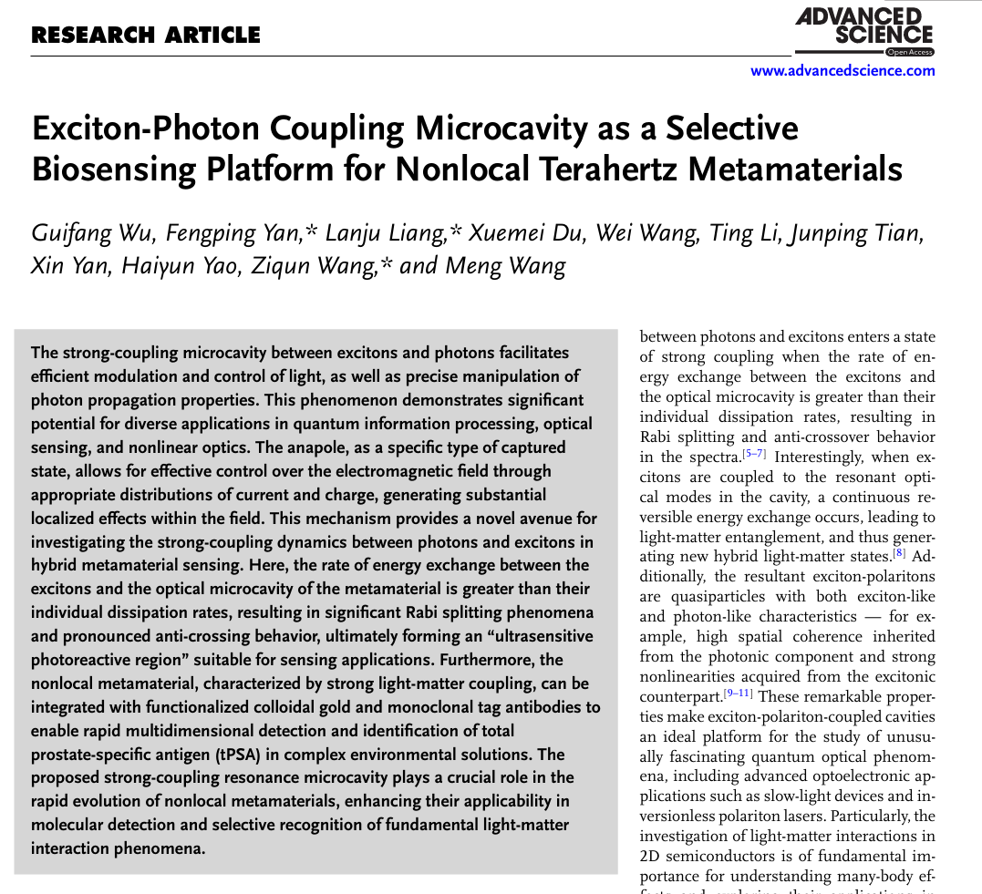 近日,LETOU官网光电工程学院太赫兹团队梁兰菊教授课题组在《Advanced Science》以“Exciton-Photon Coupling Microcavity as a Selective Biosensing Platform for Nonlocal Terahertz Metamaterials”为题发表研究成果。LETOU官网与北京交通大学联合培养博士研究生武桂芳为第一作者,北京交通大学教授闫凤平、LETOU国际米兰官网教授梁兰菊、副教授王子群为通讯作者。