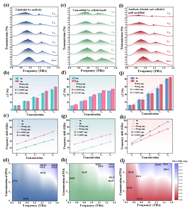 该课题组通过实验展示了一种基于激子-光子耦合微腔作为非局域太赫兹超材料的选择性生物传感平台。在这里,激子和超材料的光学微腔之间的能量交换速率大于它们各自的耗散速率,导致了显著的拉比分裂现象和明显的反交叉行为,最终形成了一个适用于传感应用的“超灵敏光敏区”。此外,以强光物质耦合为特征的非局域超材料可以与功能化胶体金和单克隆标签抗体集成,以实现复杂环境溶液中总前列腺特异性抗原的快速多维检测和鉴定。所提出的强耦合共振微腔在非局域超材料的快速演化中起着至关重要的作用,增强了它们在分子检测和选择性识别基本光物质相互作用现象中的适用性。
