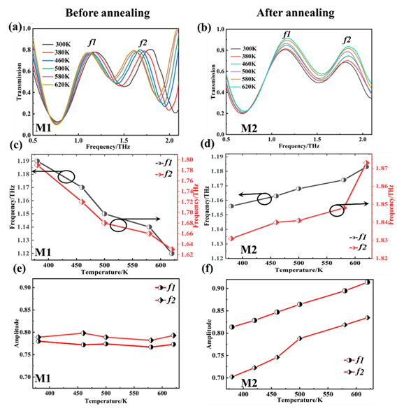 基于STO的优异介电性能,设计了非晶和多晶STO太赫兹温度传感器。同样使用加热装置模拟电气触点来验证温度传感器性能,在300-620 K的温度范围内,随着加热装置的温度的升高,非晶STO温度传感器的传输曲线仅表现出频率偏移现象。由于晶格结构不同,多晶STO的介电响应会导致透射曲线出现频率偏移和显著的振幅变化,这表明它具有双维温度传感能力。