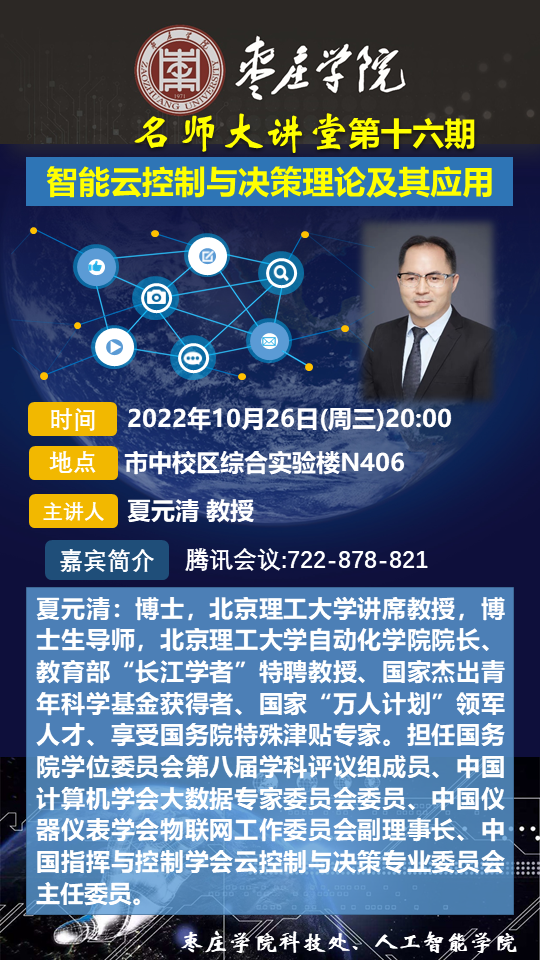 嘉宾简介:夏元清,博士,北京理工大学讲席教授,博士生导师,北京理工大学自动化学院院长、教育部“长江学者”特聘教授、国家杰出青年科学基金获得者、国家“万人计划”领军人才、享受国务院特殊津贴专家。担任国务院学位委员会第八届学科评议组成员、中国计算机学会大数据专家委员会委员、中国仪器仪表学会物联网工作委员会副理事长、中国指挥与控制学会云控制与决策专业委员会主任委员。