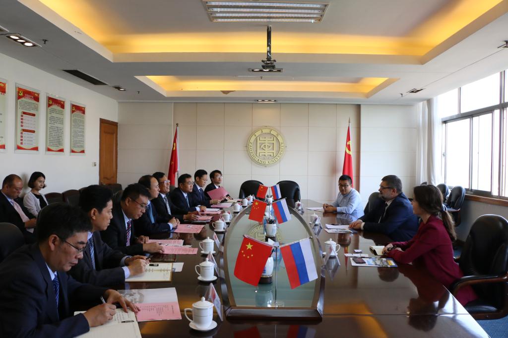 2019-09-199月18日上午,俄罗斯伏尔加格勒国立大学校长塔拉卡诺夫先生、国际合作办公室主任法捷耶娃女士等一行3人来校考察,就两校进一步加强合作事宜进行友好磋商。校党委书记曹胜强在八楼会议室与塔拉卡诺夫校长一行举行座谈...