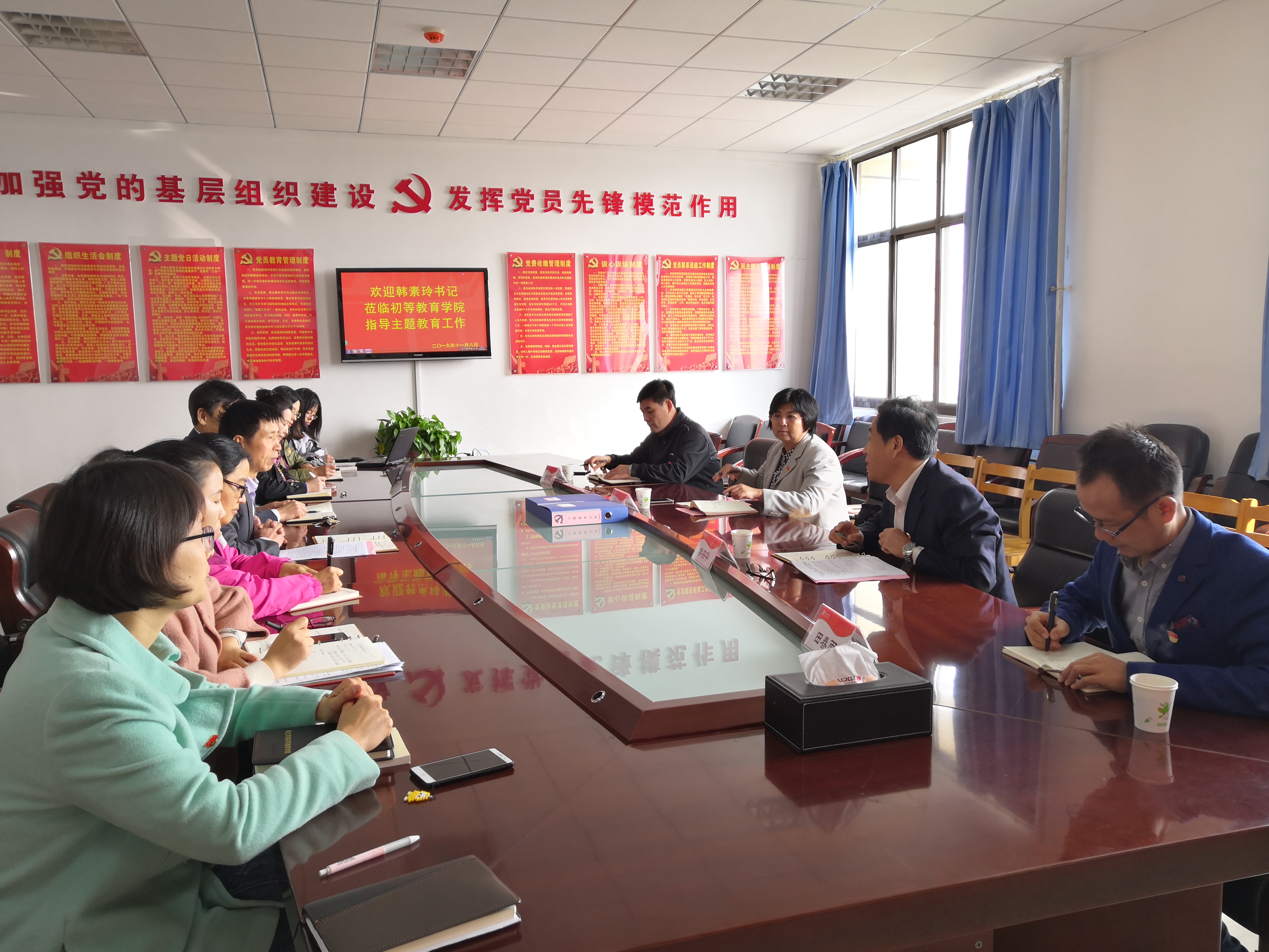 2019-11-0811月8日下午,纪委书记韩素玲到初等教育学院调研指导主题教育工作。学校主题教育第四巡回指导组组长侯宗华,成员徐海波、田春雨陪同。初等教育学院党政负责人、副科级以上党员干部及党支部书记在教师教育楼422室参加...