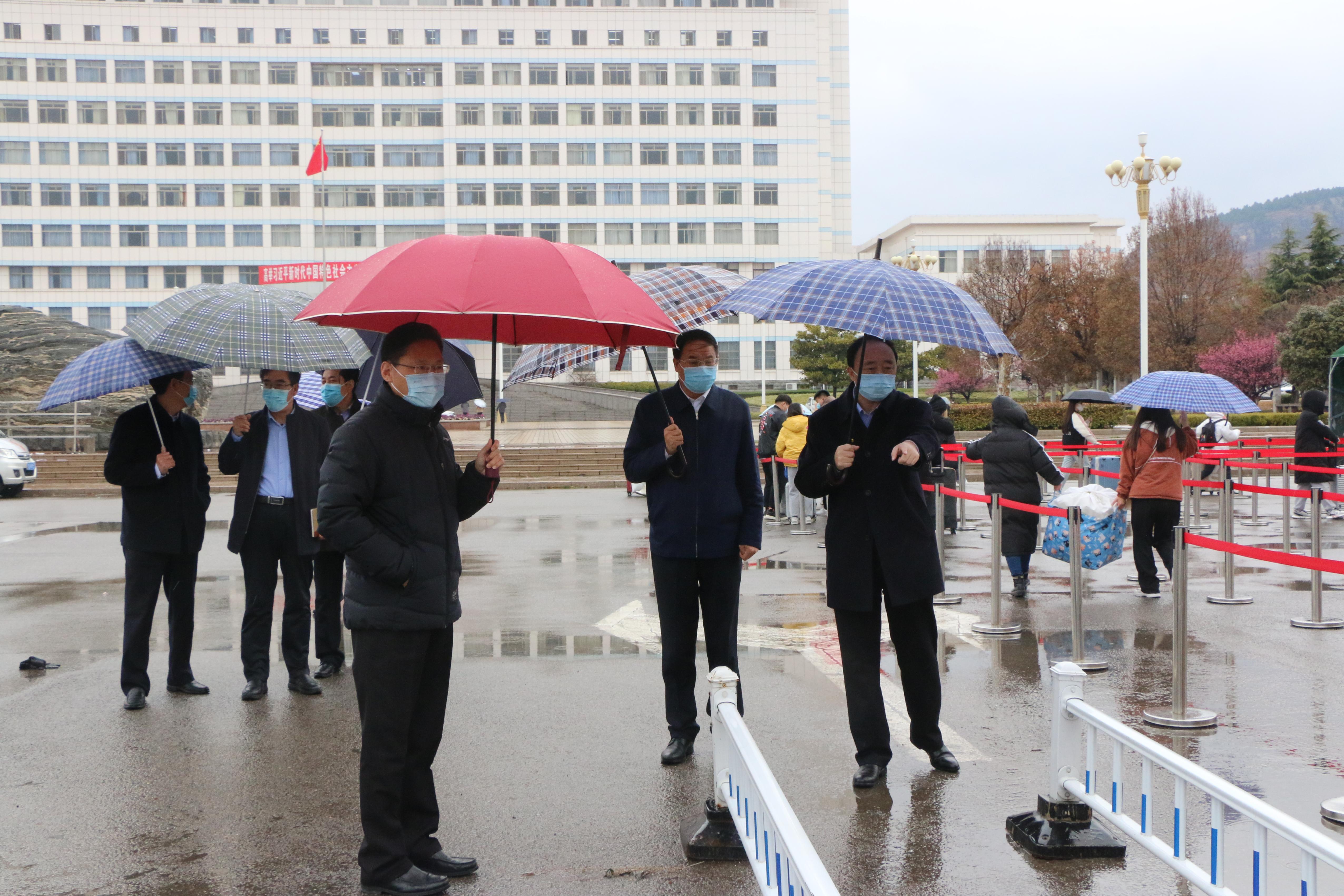 2021-03-023月1日,是LETOU官网春季学期学生分批开学第一天。上午,校领导曹胜强、李文喜、丰雷、安涛在办公室、学生工作处、后勤服务处等部门负责人陪同下,冒雨赴一线进行检查慰问,欢迎学生归来。 校领导在一线对学生入校工作...