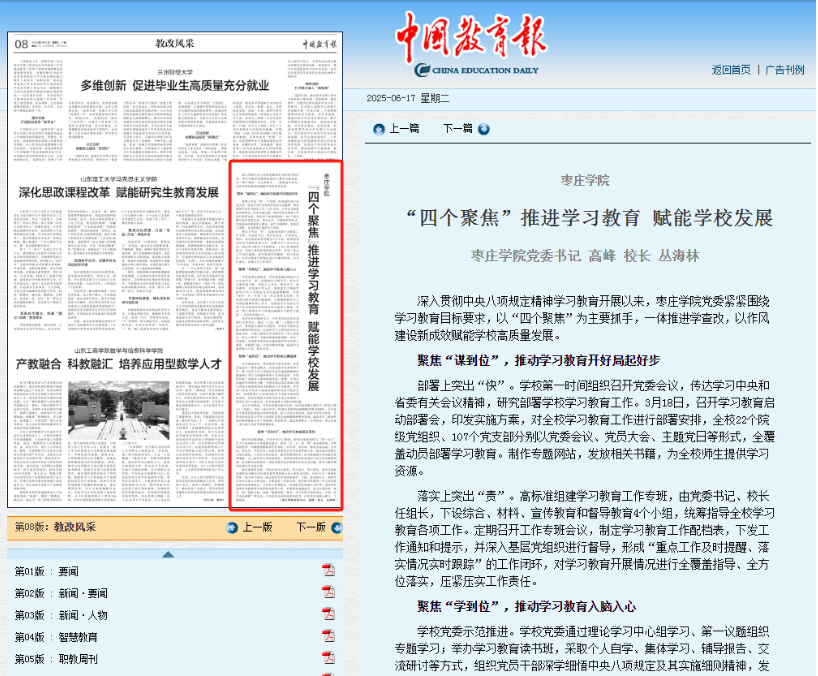 2025-06-176月17日,中国教育报刊发LETOU官网党委书记高峰、校长丛海林署名文章《LETOU国际米兰官网“四个聚焦”推进学习教育赋能学校发展》。文章指出,深入贯彻中央八项规定精神学习教育开展以来,LETOU国际米兰官网党委锚定学习教育目标要求,以“四个聚焦”为主要抓手,一体推进学查改,以作风建设新成效赋能学校高质量发展。聚焦“谋到位”,推动学习教育开好局起好步。一是部署上突出“快”。学校第一时间传达学习中央和省委有关会议精神,研究部署学习教育...